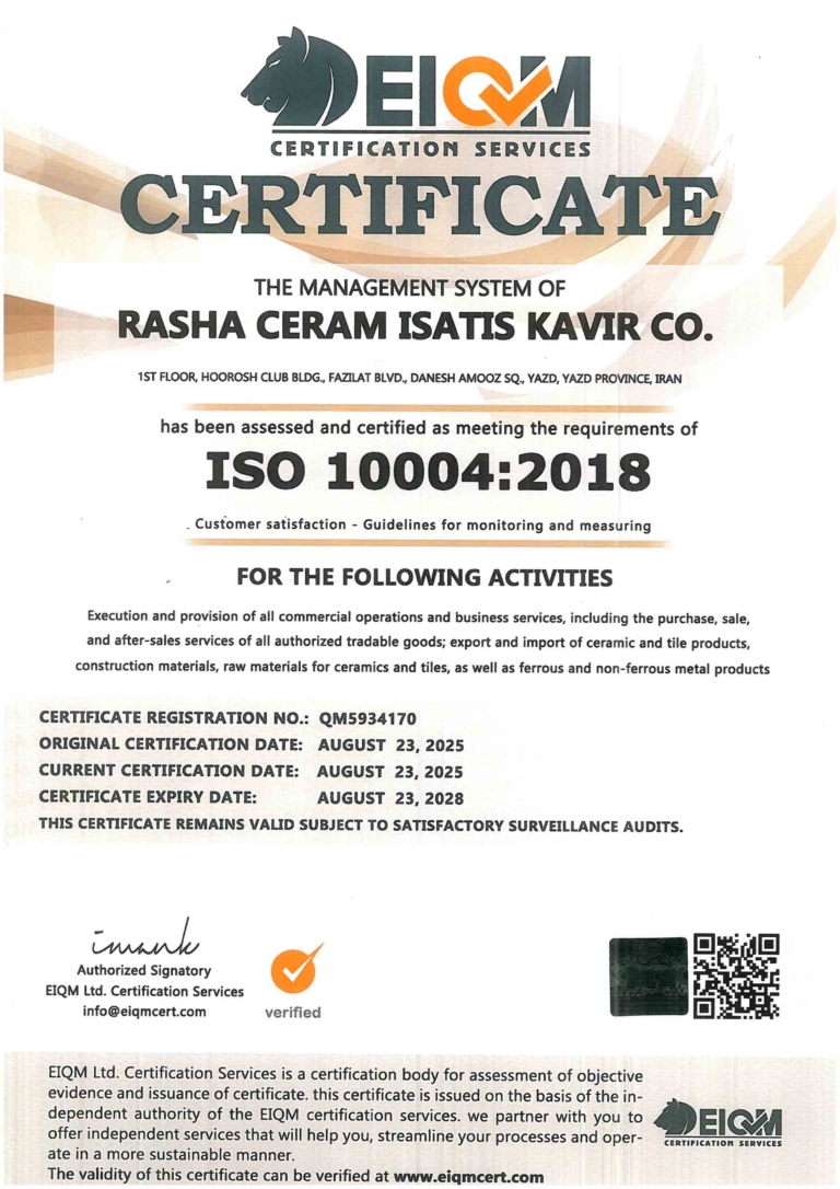 ISO 10004 is an international standard that helps organizations effectively monitor, measure, and improve their customer satisfaction. It provides guidance for collecting, analyzing, and using customer satisfaction information. Rasha Ceram ultimate goal is to have more satisfied and loyal customers.