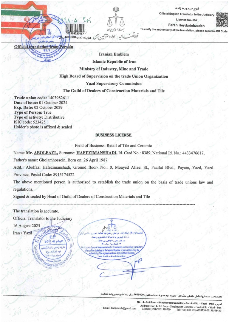 Add.: Abolfazl Hafezimanshadi, Ground floor- No.: 0, Moayed Allaei St., Fazilat Blvd., Payam, Yazd, Yazd Province, Postal Code: 8915174522