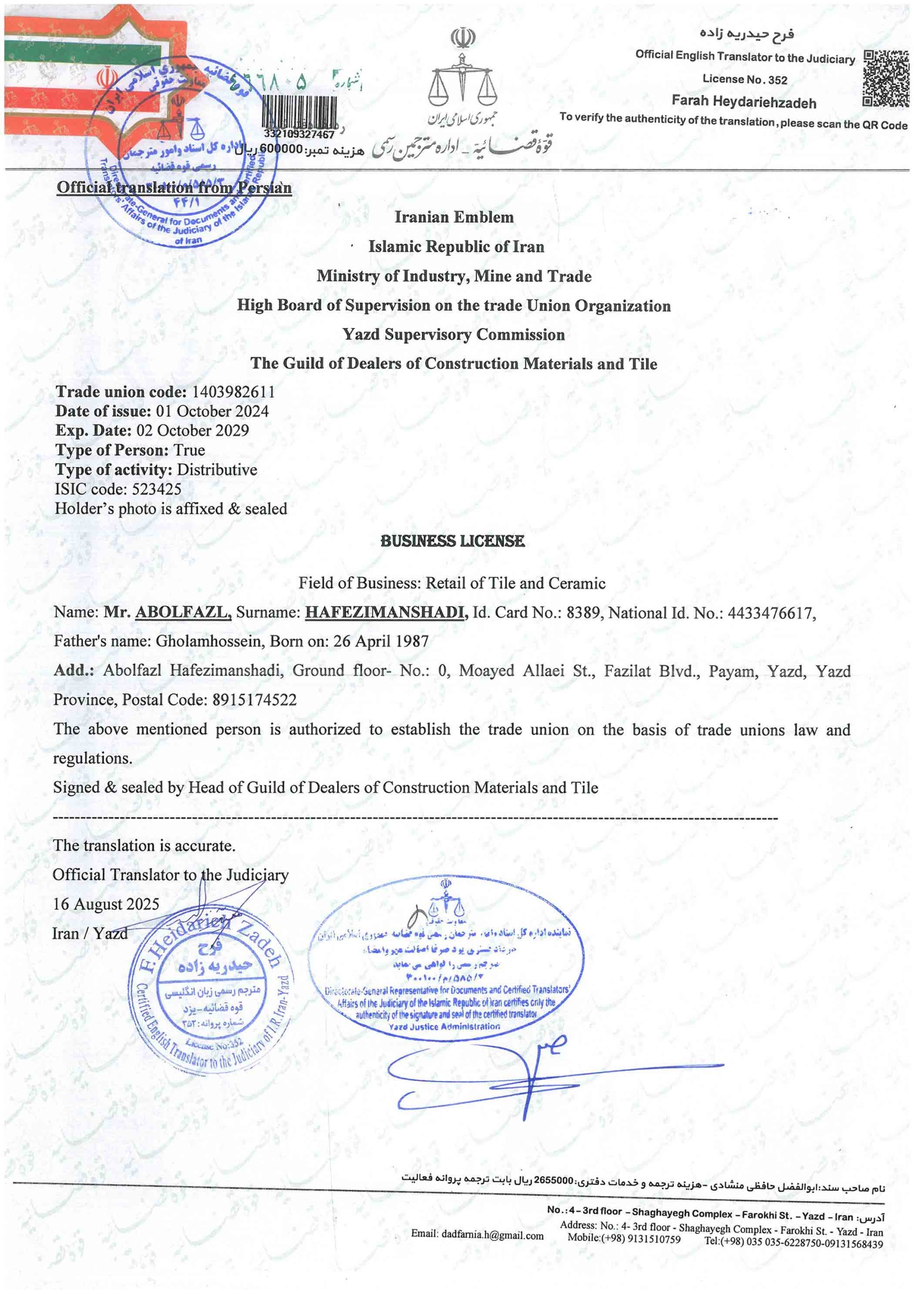 Signed & sealed by Head of Guild of Dealers of Construction Materials and Tile .