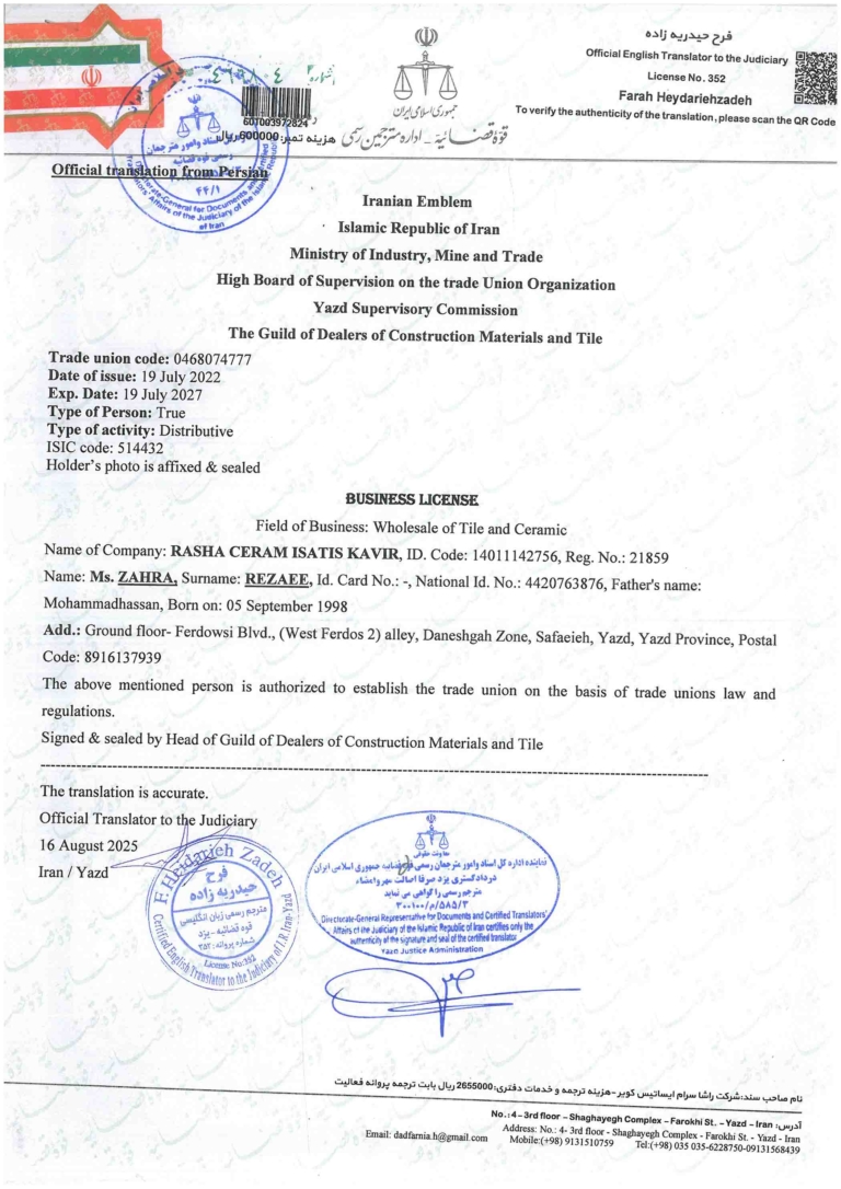 Name of Company: RASHA CERAM ISATIS KAVIR, ID. Code: 14011142756, Reg. No.: 21859