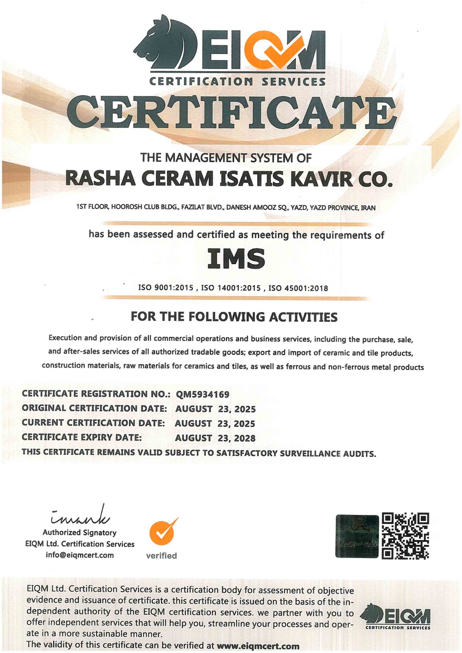 At Rasha Ceram, we are proud to be ISO 9001:2015 certified, a globally recognized standard for quality management systems. This certification reflects our commitment to delivering premium porcelain and ceramic tiles that meet international standards of quality, reliability, and customer satisfaction. By following ISO 9001:2015 guidelines, we ensure continuous improvement, streamlined processes, and consistent excellence in every product we manufacture and export.